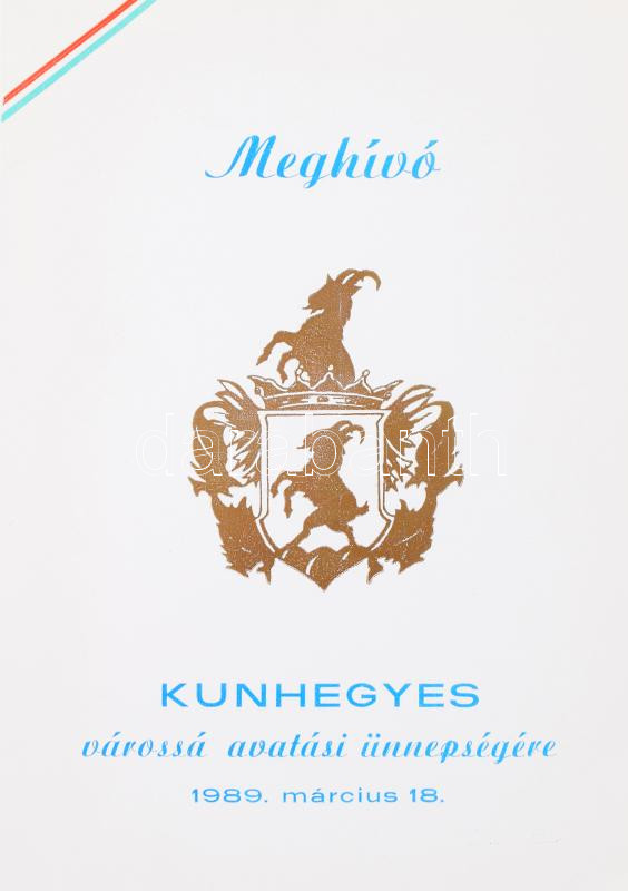 Leírás: 1989 Kunhegyes várossá avatási ünnepségégére szóló meghívó, + Program, + fogadásra meghívó.