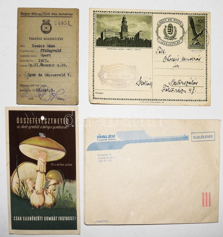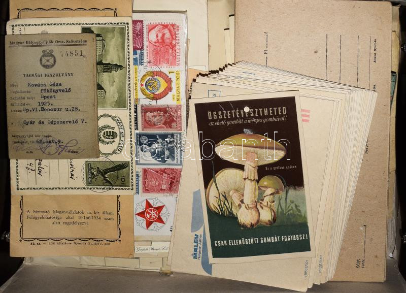 Leírás: Egy doboznyi papírrégiség, vegyes iratok, Malév, okmányok, reklám, némi filatélia