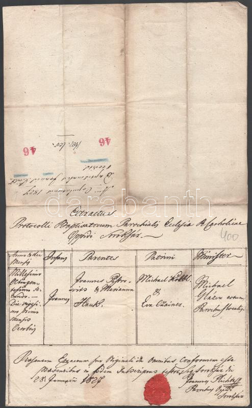 1827 Soroksár, latin nyelvű születési anyakönyvi kivonat / keresztlevé... https://www.darabanth.com/hu/506-Gyorsarveres/506.0/Mutargy-papirregiseg-egyeb/Okmanyok~62/1827-Soroksar-latin-nyelvu-szuletesi-anyakonyvi-kivonat-keresztlevel-serult-viaszpecset~II3431214