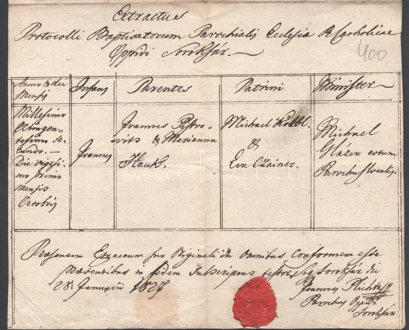 Leírás: 1827 Soroksár, latin nyelvű születési anyakönyvi kivonat / keresztlevél, sérült viaszpecséttel