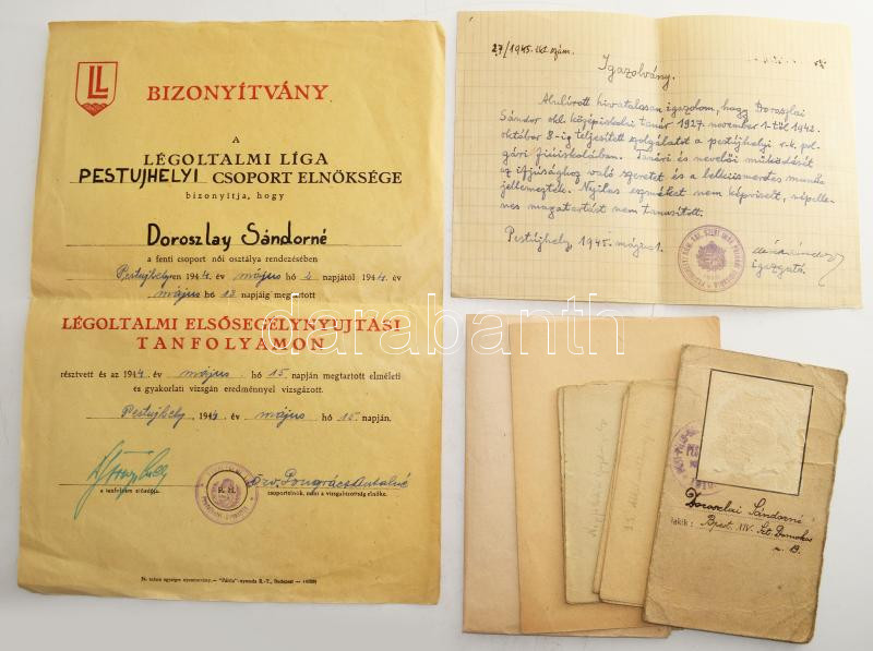 1918-1945 Doroszlai Sándor és felesége iratai: katonai iratok (népfölkelési igazolvány, alkalmatlansági bizonyÃtvány), légoltalmi elsÅ‘segélynyújtási tanfolyam bizonyÃtványa, származási táblázat, magyar-orosz kétnyelvű igazolvány, stb., összesen 7 db, vegyes állapotban