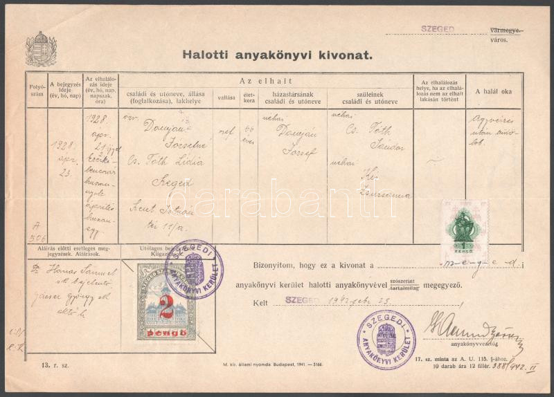 Leírás: 1939-1942 2 db anyakönyvi kivonat szegedi és gyulai illetékbélyegekkel