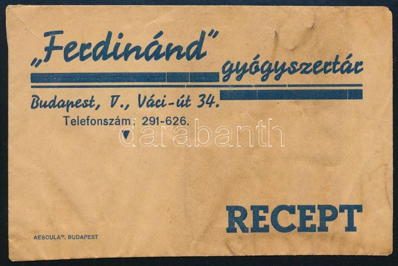 Leírás: "Ferdinánd" Gyógyszertár Bp. V. receptboríték, foltos