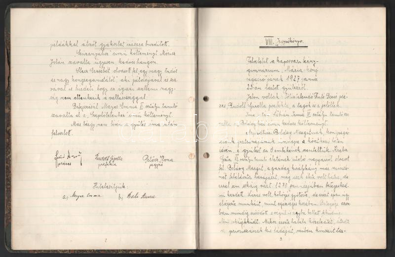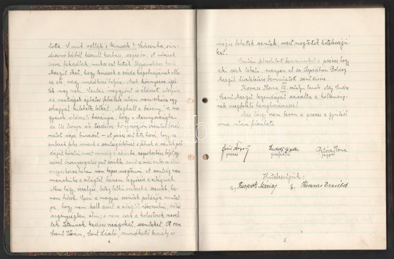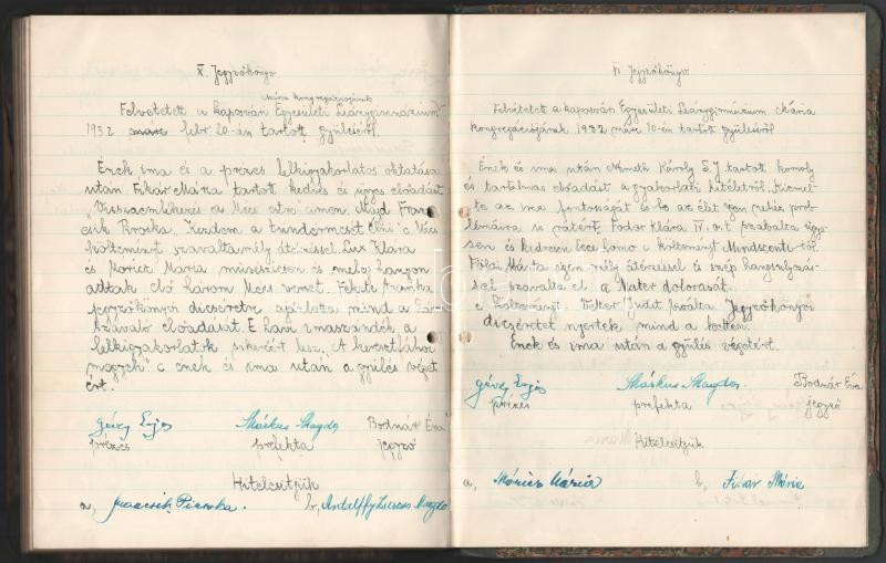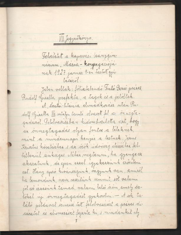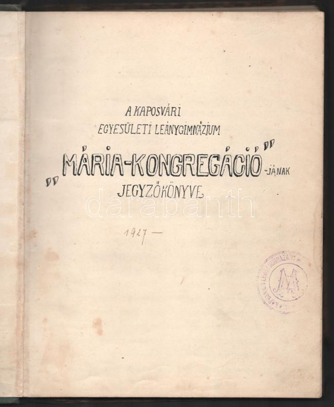 1927-1932 A kaposvári egyesületi leánygimnázium ,,Mária-kongregáció"-jának jegyzőkönyve, több éven keresztül vezetett, összesen kb. 150-200 oldalnyi bejegyzéssel. Félvászon-kötésben, sérült gerinccel.