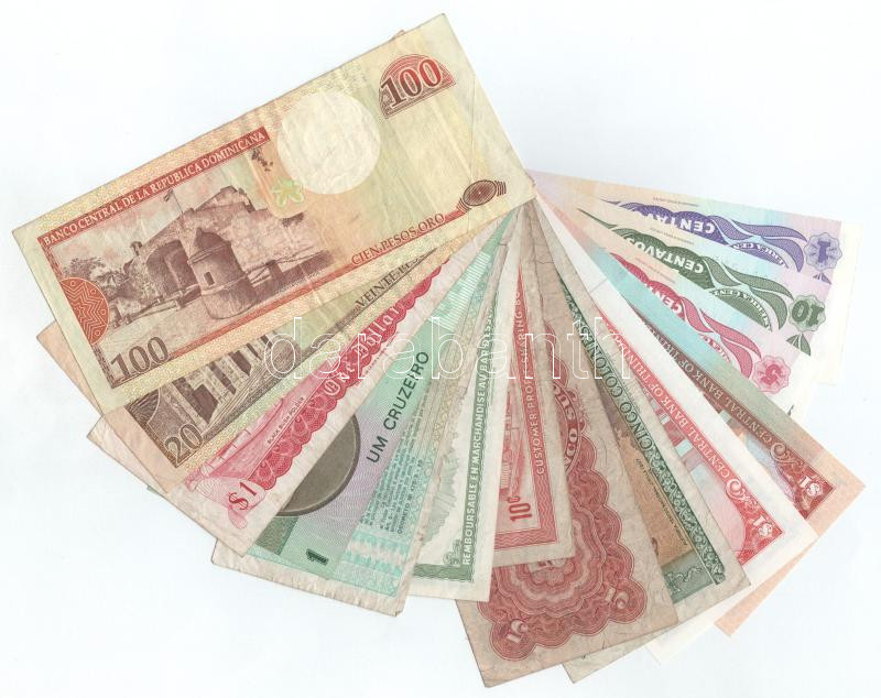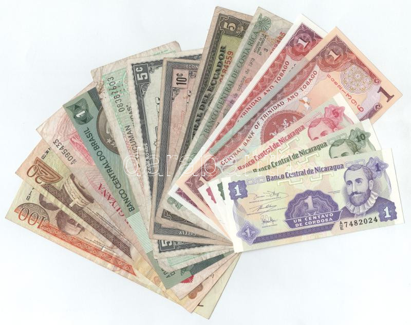 Vegyes, 14db-os külföldi bankjegy tétel, közte Costa Rica 1973. 5C + Dominikai Köztársaság 2001. 20P + 100P + 3db csekk, stb. T:UNC-VG
