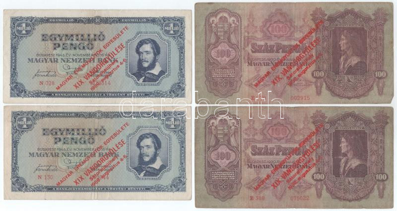 Leírás: 1930. 100P (2x) + 1945. 1.000.000P (2x) mindegyik "Magyar Éremgyűjtők Egyesülete XIX. Vándorgyűlése Sátoraljaújhely 1989. augusztus 4-6. " felülbélyegzéssel T:F,VG