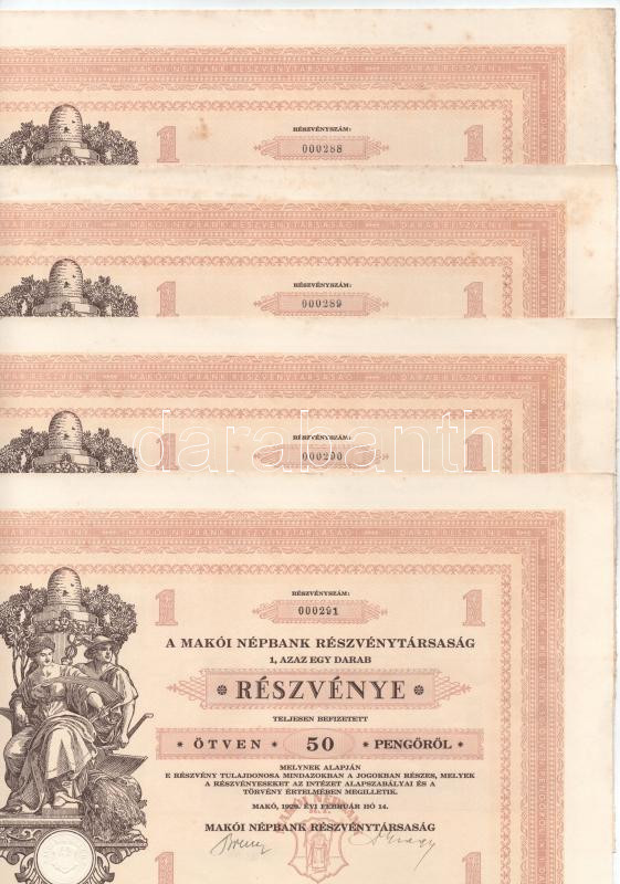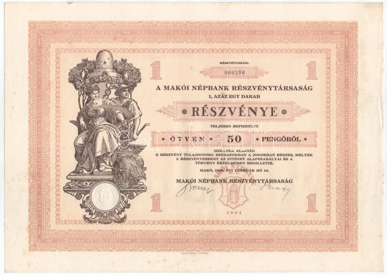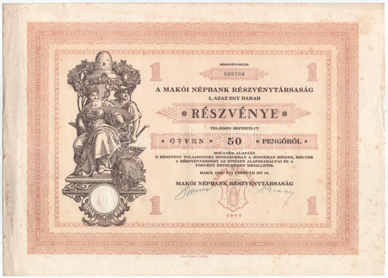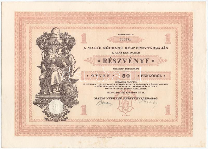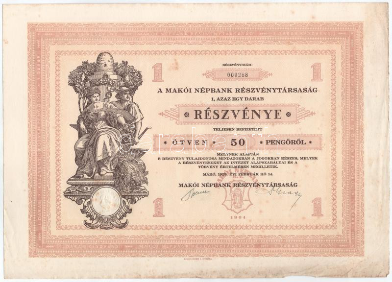 Leírás: 1929. Makó "Makói Népbank Részvénytársaság " részvénye 50P-ről, szelvényekkel, szárazpecséttel (4x), sorszámkövetők T:AU,XF folt