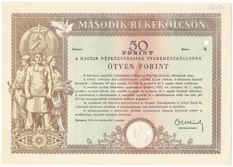 1951. Budapest "Második Békekölcsön - a Magyar Népköztársaság nyereménykölcsöne" 50Ft értékben, sorozat és sorszám nélkül, szárazpecséttel, lyukasztással érvénytelenítve T:AU,XF jobb felső sarokban kézírásos, tintával írt számjelzés