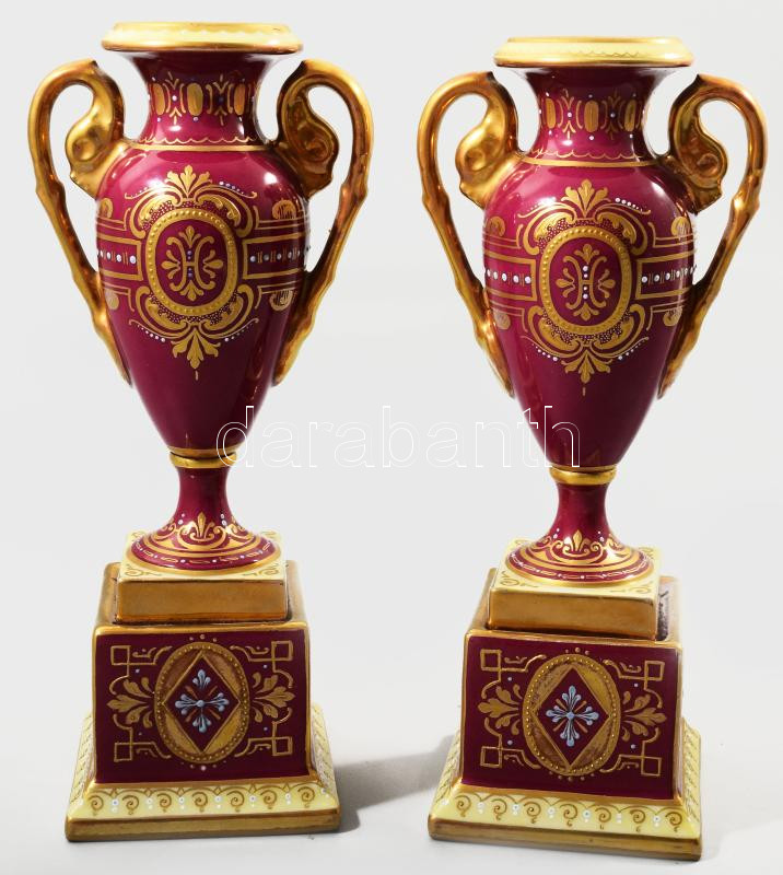 Leírás: Alt wien historizáló zsánermintás díszváza pár, kézzel festett, jelzett, hibátlan, m: 19,5 cm