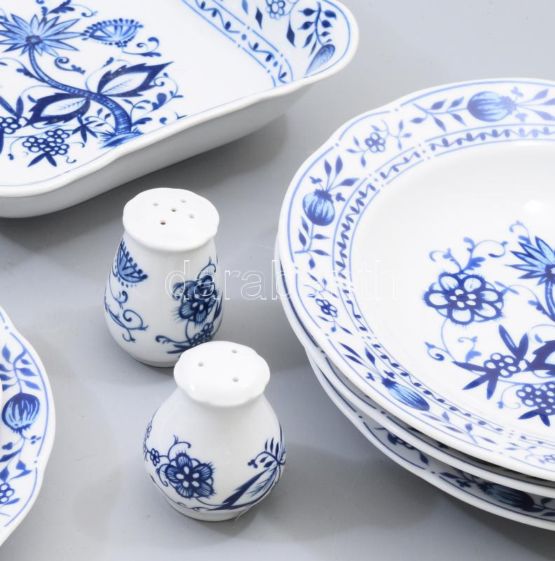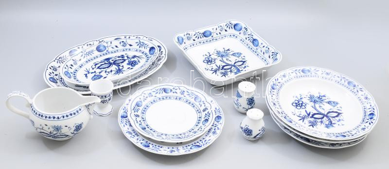 Leírás: Kahla hagymamintás étkészlet 12 darabja, közte kínálótálakkal, jelzett.