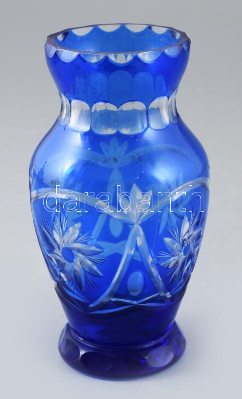 Leírás: Kéken pácolt kristály váza, jelzés nélkül, m: 14 cm