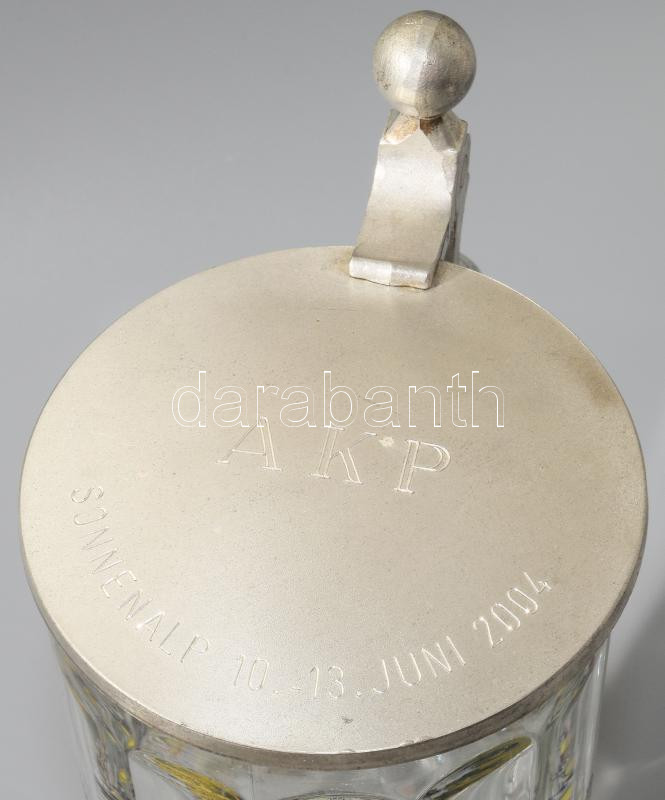 Leírás: Ónfedeles címeres üveg korsó, m: 22 cm