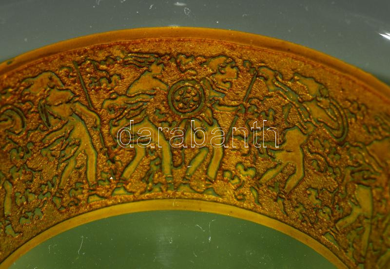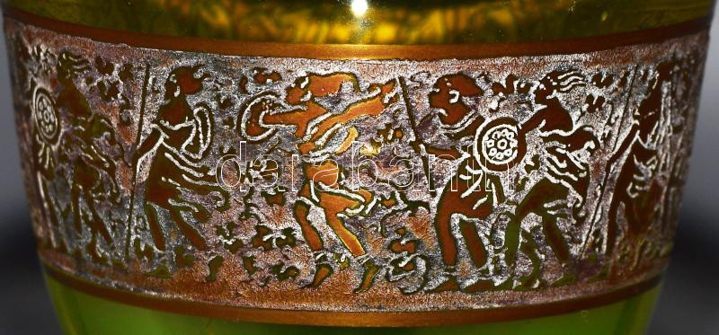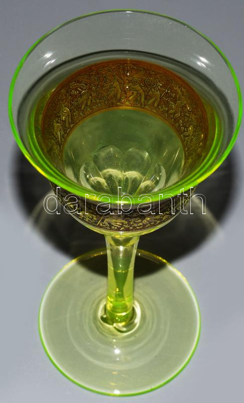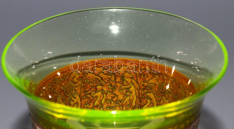 Leírás: cca 1910/30 Moser Karlsbad urániumüveg talpas pohár, körbefutó aranyozott fríz díszítéssel, jelzés nélkül, minimális kopással, m: 18 cm