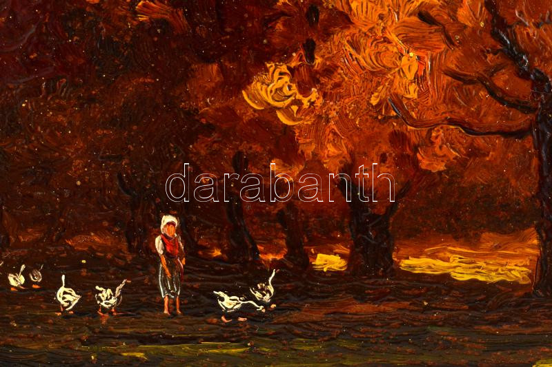 Leírás: Olvashatatlan jelzéssel: Libapásztorlány. Olaj, karton. Kissé vetemedett. Dekoratív, kissé sérült fakeretben. 24,5×34,5 cm