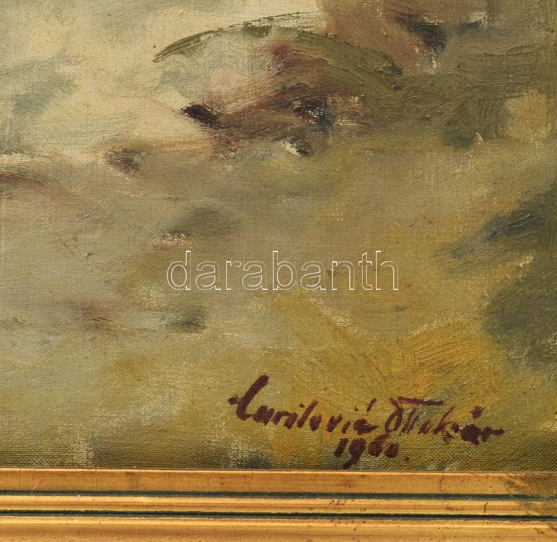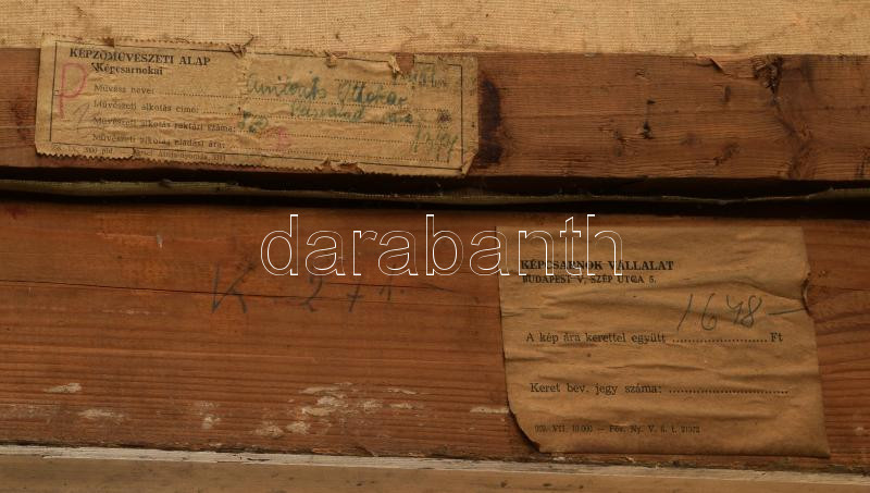 Curilovics Ottokár (1908-1961): Pécsvárad vára, 1960. Olaj, vászon, jelzett, hátoldalán a Magyar Képzőművészek és Iparművészek Baranyai Csoportja, Pécs raglapjával és Képcsarnok Vállalat címkéivel. Dekoratív, kissé sérült fakeretben. 60x68,5 cm.