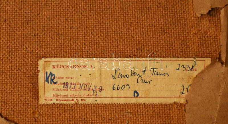 Leírás: Darabont Tamás (1930-): Csűr, 1973 körül. Olaj, farost, jelzett. Hátoldalán Képcsarnok Vállalat címkéivel. Üvegezett fakeretben, 60×80 cm