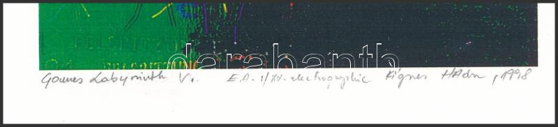 Leírás: Haász Ágnes (1951-): Games labyrinth V, 1998. Elektrográfia, papír. Jelzett. Művészpéldány E.A. I/XV számozással. Hátoldalán címkén feliratozott. Lapszéli kisebb elszíneződéssel. 15x10 cm