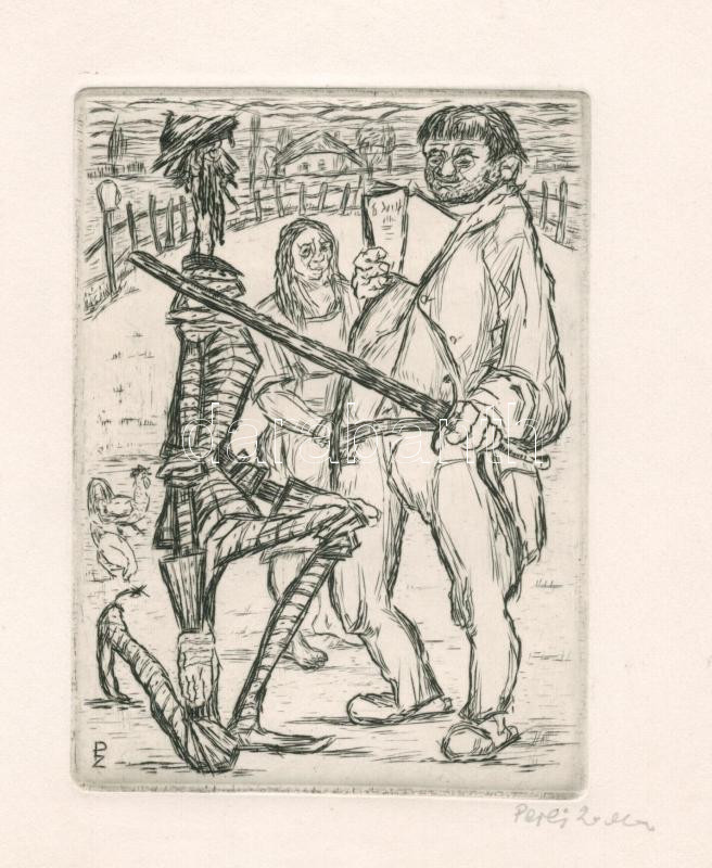 Perei Zoltán (1913-1992): A viaskodás után lovaggá ütik (Don Quijote illusztráció), 1949. Rézmetszet, papír, jelzett. Az 1949-ben megjelent Don Quijote de la Mancha élete c. mappából. 12x9 cm. Ritka!