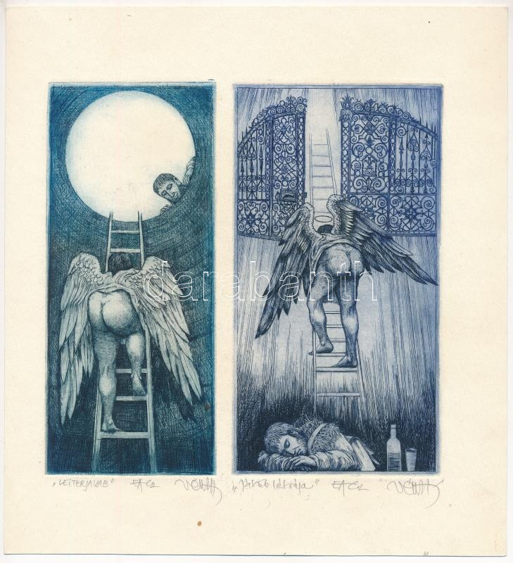 Leírás: Vén Zoltán (1941-), 2 db mű egy lapon: Jákob létrája. Rézmetszet, papír. Jelzett. Művészpéldány EA jelzéssel. 16x7 és 16x8,5 cm