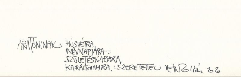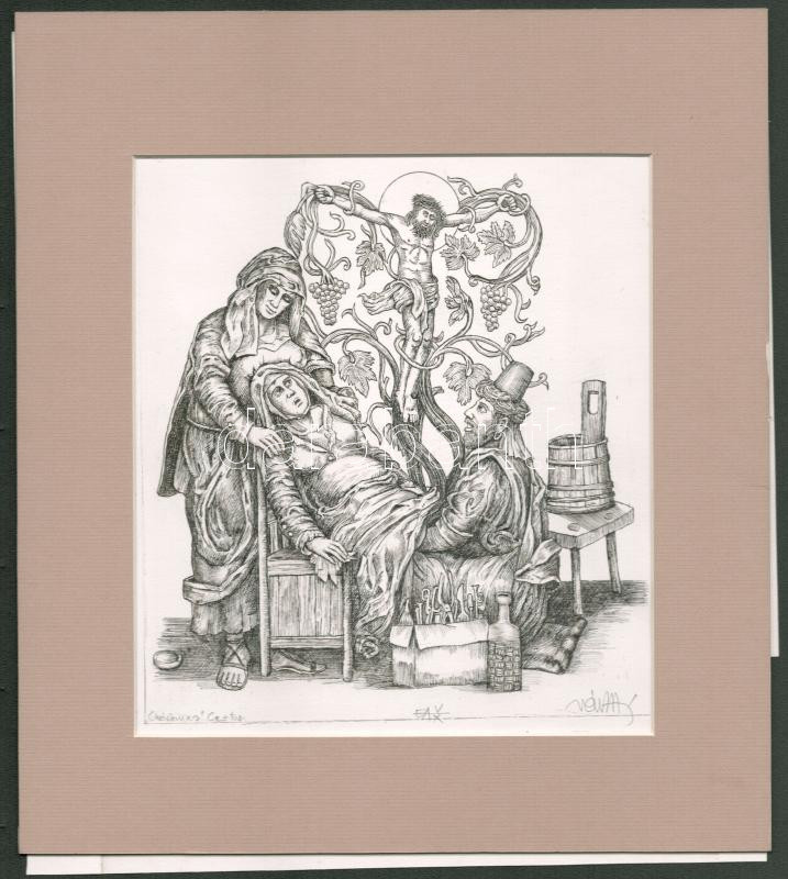 Vén Zoltán (1941-): Karácsony. Rézmetszet, tus, papír, jelzett, paszpartuban, hátoldalán Vén Zoltán autográf ajánlásával Arató Antal gyűjtő részére. 19×17 cm