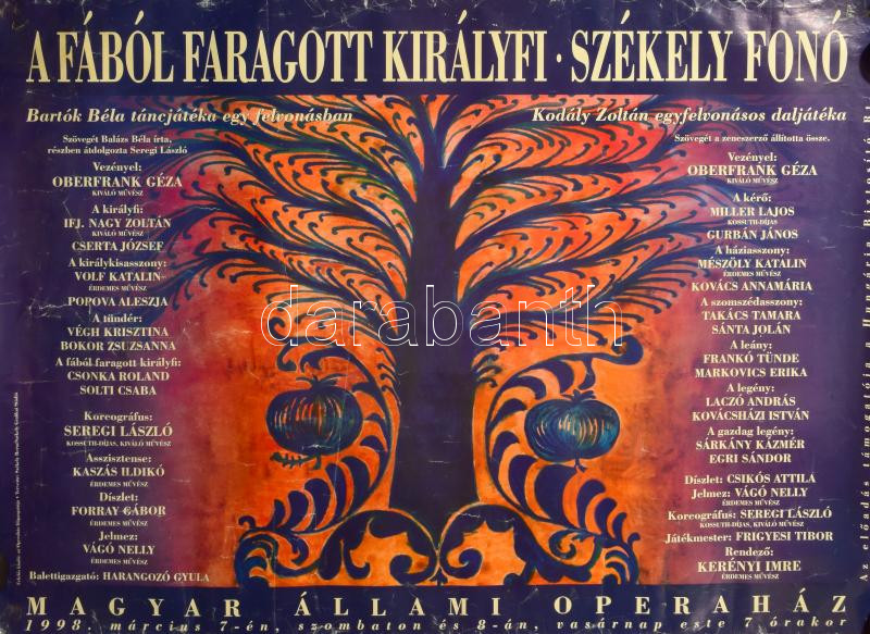 1998 Fából faragott királyfi, Székely Fonó (Bartók, Kodály), Magyar Állami Operaház, plakát, papír, feltekerve, gyűrött, lapszéli apró szakadásokkal, 60x82 cm