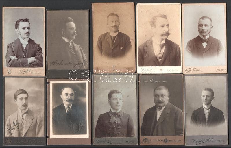 10 db férfiakat ábrázoló vizitkártya, különféle műtermekből (közte Meinhardt Ágoston, Pápa; Bokor Géza, Sopron; Letzter József, Debrecen; stb.), változó állapotban