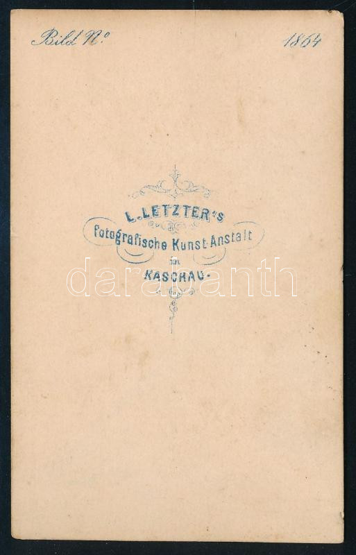 Leírás: 1864 Elegáns férfi egészalakos portréja, vizitkártya Letzter Lázár (1832-1897) kassai műterméből, 10,5x6,5 cm