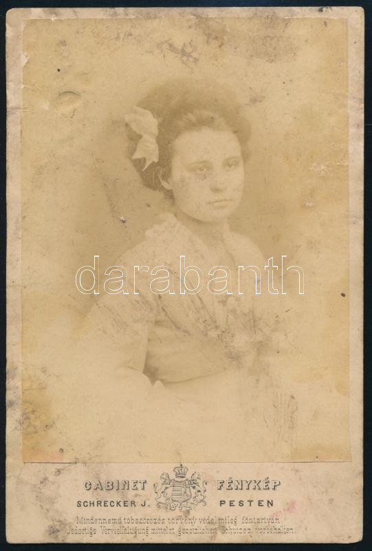 Leírás: 1870 Női portré, keményhátú fotó Schrecker pesti műterméből, sérült, 16,5×10,5 cm