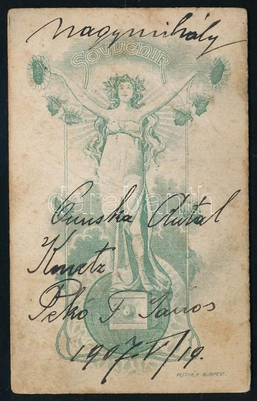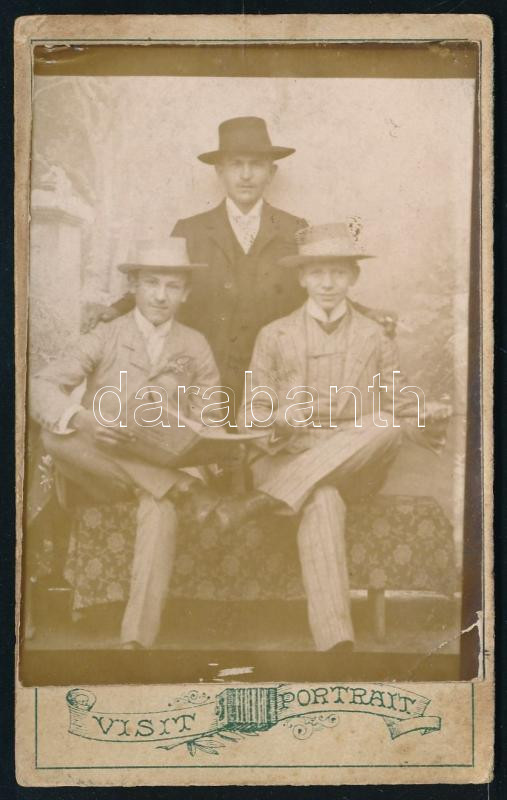 Leírás: 1907 Három kalapos fiatalember portréja, vizitkártya, a hátoldalon feliratozva, kissé viseltes, 11x6,5 cm