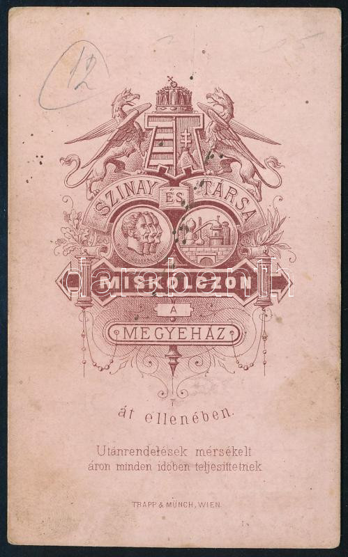 Leírás: cca 1880 Fiatal férfi portréja, vizitkártya Szinay és Társa miskolci műterméből (,,Miskólczon a Megyeház át ellenében"), kissé foltos, 10,5x6,5 cm
