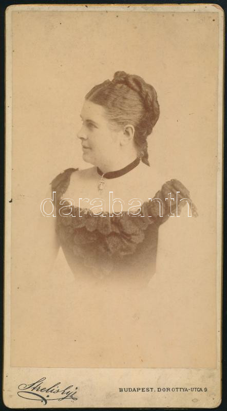 Leírás: cca 1885 Hölgy portréja, keményhátú fotó Strelisky budapesti műterméből, 21×11 cm