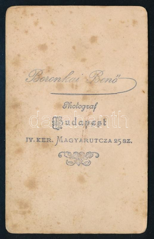 cca 1890 Hölgy egészalakos portréja, vizitkártya Boronkai (Boronkay) Benő budapesti műterméből (IV. ker. Magyar utcza 25 sz.), kissé foltos, 10,5x6,5 cm (Ritka!)