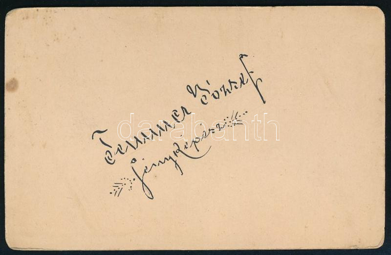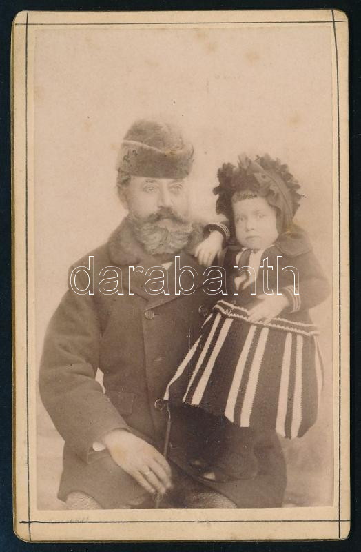 cca 1890 Szőrmesapkát viselő szakállas úr kislánnyal, vizitkártya Temmer József budapesti fényképész műterméből, kézzel feliratozott verzóval, 10,5x6,5 cm (Ritka!)