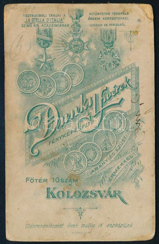 Leírás: cca 1900 Két fiatal lány portréja, vizitkártya a Dunky fivérek kolozsvári műterméből, kissé viseltes, foltos, 10,5x6,5 cm
