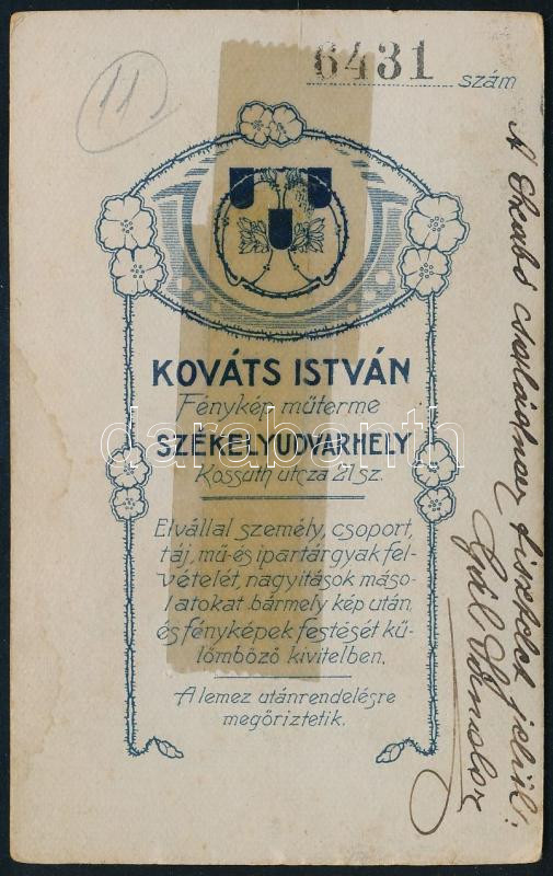 Leírás: cca 1910 Öltönyös úr portréja, vizitkártya Kováts István székelyudvarhelyi műterméből, a hátoldalon dedikációval, ragasztással, 10,5x6,5 cm