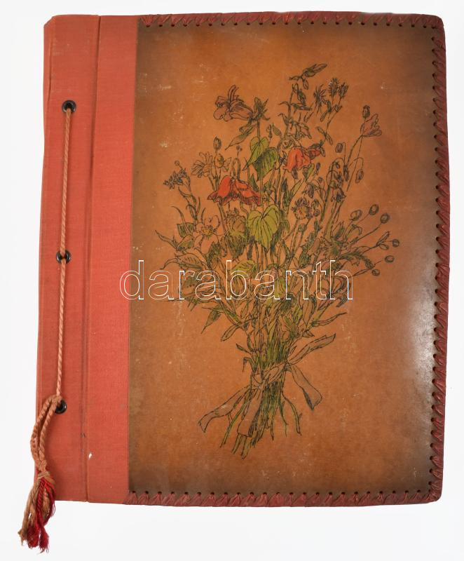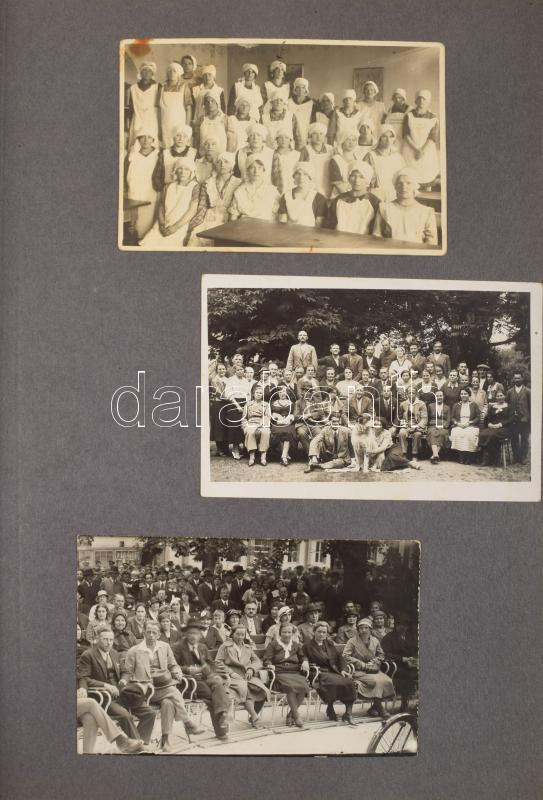 cca 1920-1940 Fotóalbum vegyes felvételekkel, közte újságárus a Grand Café Astoria előtt, dohányboltok, csoportképek, portrék, családi fotók, összesen 38 db beragasztott fotó, vegyes méretben, zsinórfűzéses albumban, 34,5x28,5x2,5 cm