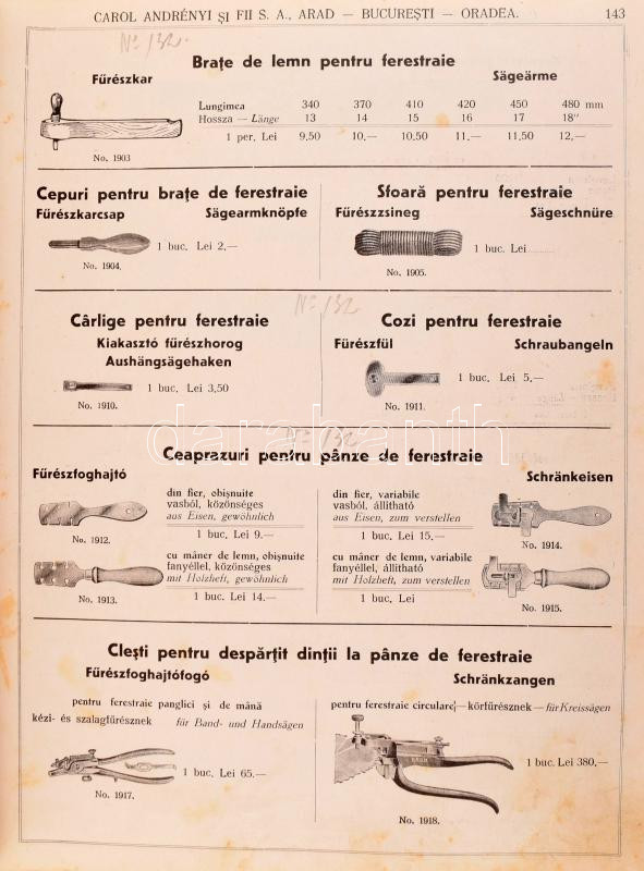 1939 Carol Andrényi si Fii S. A. fierarie en gros Arad-Bucuresti-Oradea (Andrényi Károly és Fiai vasáru nagykereskedés Arad-Bukarest-Nagyvárad) 1836-1939 árukatalógus, fekete-fehér képekkel, román, magyar és német nyelven. Kiadói egészvászon-kötés, viseltes, sérült borítóval, helyenként foltos lapokkal, néhány lap kijár, az első 12 oldal hiányzik, 13-416 p.