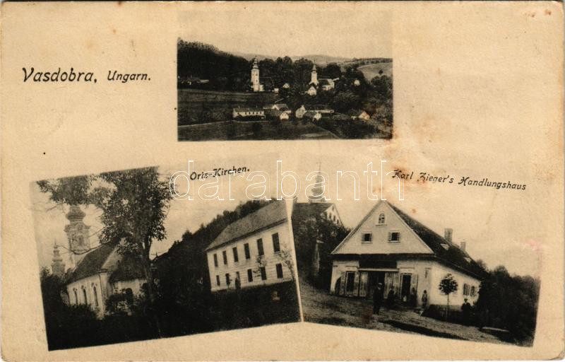 Vasdobra, Vas-Dobra, Neuhaus am Klausenbach; Orts-Kirchen, Karl Zieger's Handlungshaus / látkép, templomok, Karl Zieger üzlete. L. Wontschina Photogr. / general view, churches, shops of Zieger (felületi sérülés / surface damage)