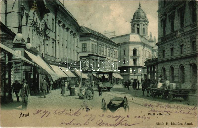 1904 Arad, Atzél Péter utca, lóvasút, üzletek. Bloch H. kiadása / stre... https://www.darabanth.com/hu/508-Gyorsarveres/508.0/Kepeslapok/Erdely~582/1904-Arad-Atzel-Peter-utca-lovasut-uzletek-Bloch-H-kiadasa-street-view-horse-drawn-rai~II3436487