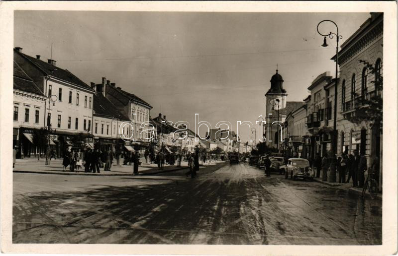 Leírás: 1943 Kolozsvár, Cluj; Deák Ferenc utca, üzletek, autók / street view, automobiles, shops
