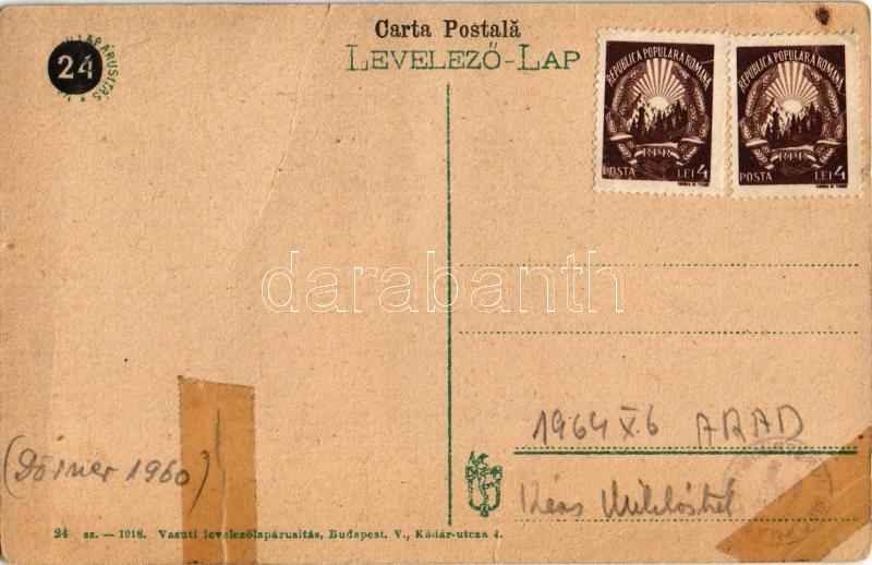 Leírás: Arad, Vértanú szobor, Schwarz Testvérek, Weigl, Bogsán és Iványi, Kovács üzlete. Vasúti levelezőlapárusítás 24. sz. 1918. / Statuia Martirilor / Martyrs' monument, shops (r)