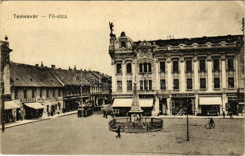 Leírás: Temesvár, Timisoara; Fő utca, Marokkáner szálloda, Nenadovits, Grosz Lajos, Bleier M., Schneider János üzlete, villamos / street, hotel, shops (EB)