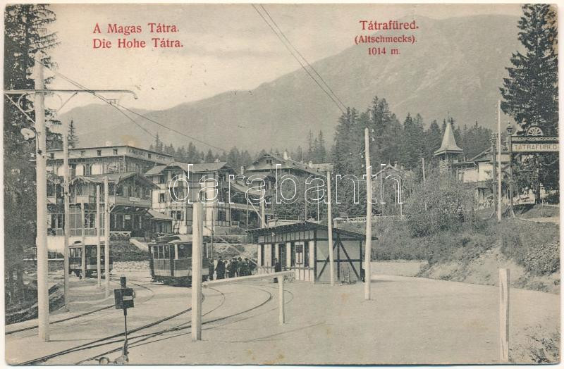 Leírás: 1917 Tátrafüred, Ótátrafüred, Altschmecks, Stary Smokovec (Magas-Tátra, Vysoké Tatry); Ótátrafüred villamos vasútállomás, megállóhely, kávéház / tram station, tramways, railway station, café (szakadás / tear)