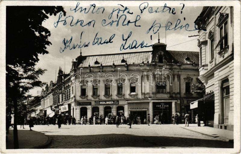 Losonc, Lucenec; Cast hlavnej ulice a námestie Republiky / Fő utca, Köztársaság tér, Bata, Tarjányi, Redlinger, Eugen Singer, The Forever Shoe üzlete. Marcel Filó kiadása / main street, square, shops + "1938 Losonc visszatért" So. Stpl. (EK)