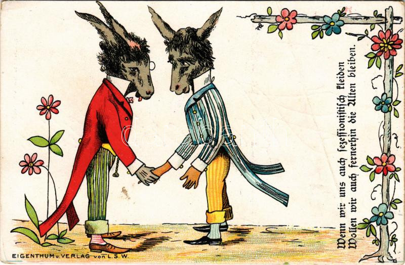 Wenn wir uns auch sezessionistisch kleiden, wollen wir auch fernerhin die Alten bleiben / humour art postcard with donkeys. Eigentum u. Verlag von L.S.W. litho (fa)