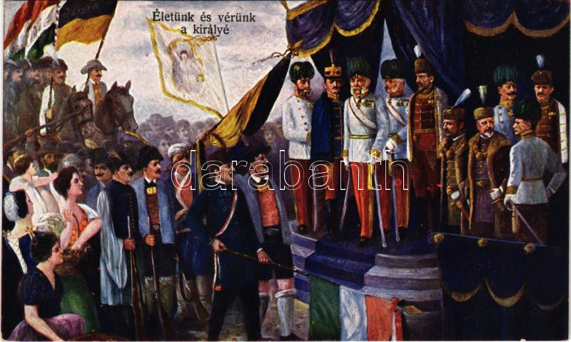 Életünk és vérünk a királyé. A királysátorban álló személyiségek: József Ferdinánd főherceg, Károly Ferenc József főherceg és trónörökös, Őfelsége Ferenc József király, Jenő főherceg, Tisza István gróf miniszterelnök, Báró Burián külügyminiszter, Hötzendorfi Conrad vezérkari főnök, Krobatini Sándor hadügyminiszter, Báró Hazai Samu honvédelmi miniszter / WWI Austro-Hungarian K.u.K. military art postcard