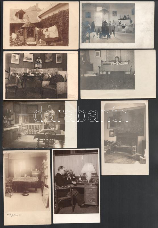 Leírás: 8 db RÉGI fotós képeslap: polgári lakások szoba belsői, udvar kerekes kúttal / 8 pre-1945 photo postcards: apartments interior, courtyard
