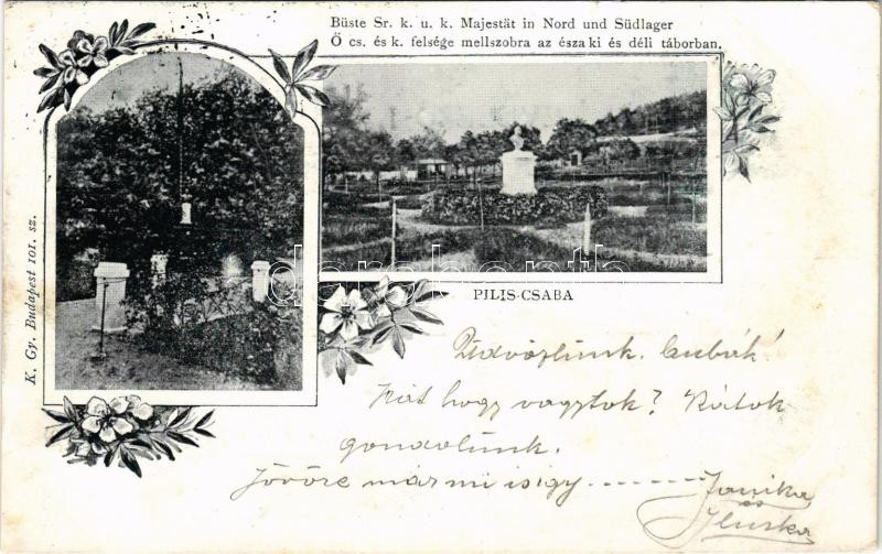 1900 Piliscsaba, Ő cs. és k. felsége Ferenc József mellszobra az északi és déli táborban. K. Gy. 101. sz. Art Nouveau, floral (apró szakadás / tiny tear)