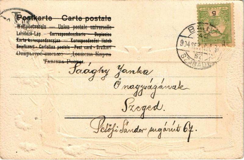 Leírás: 1904 Tájkép. Szecessziós-virágos dombornyomott litho művészlap Palicsról / Landscape. Art Nouveau, floral, Emb. litho art postcard sent from Palic (lyukak / pinholes)