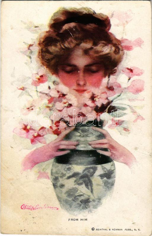 Leírás: 1912 "From Him" Lady art postcard. Reinthal & Newman No. 214. s: Philip Boileau (lyukak / pinholes)